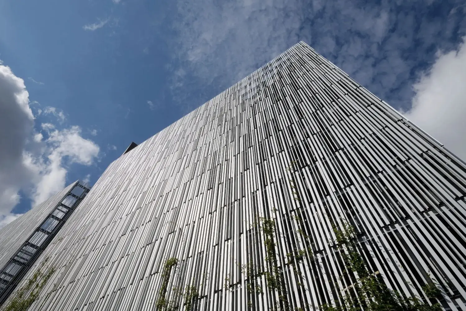 Het gevelsysteem is Napsu, en met zijn aluminium lamellen werd het geëerd voor een lichtexpressie die werd gecreëerd door twee lamellenmaten te combineren, wat ook bijdraagt aan een prachtig grafisch spel.