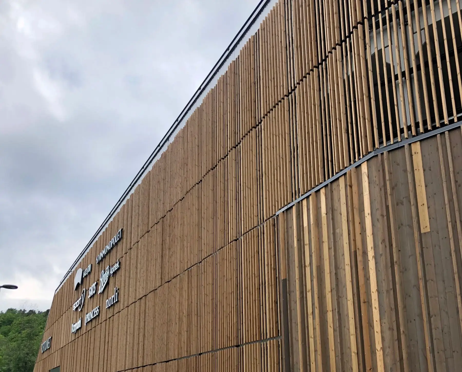 Het winkelcentrum en de bijbehorende parkeergarage zijn volledig bedekt met thermische lamellen. De look is strak, eenvoudig en past goed bij de omgeving.