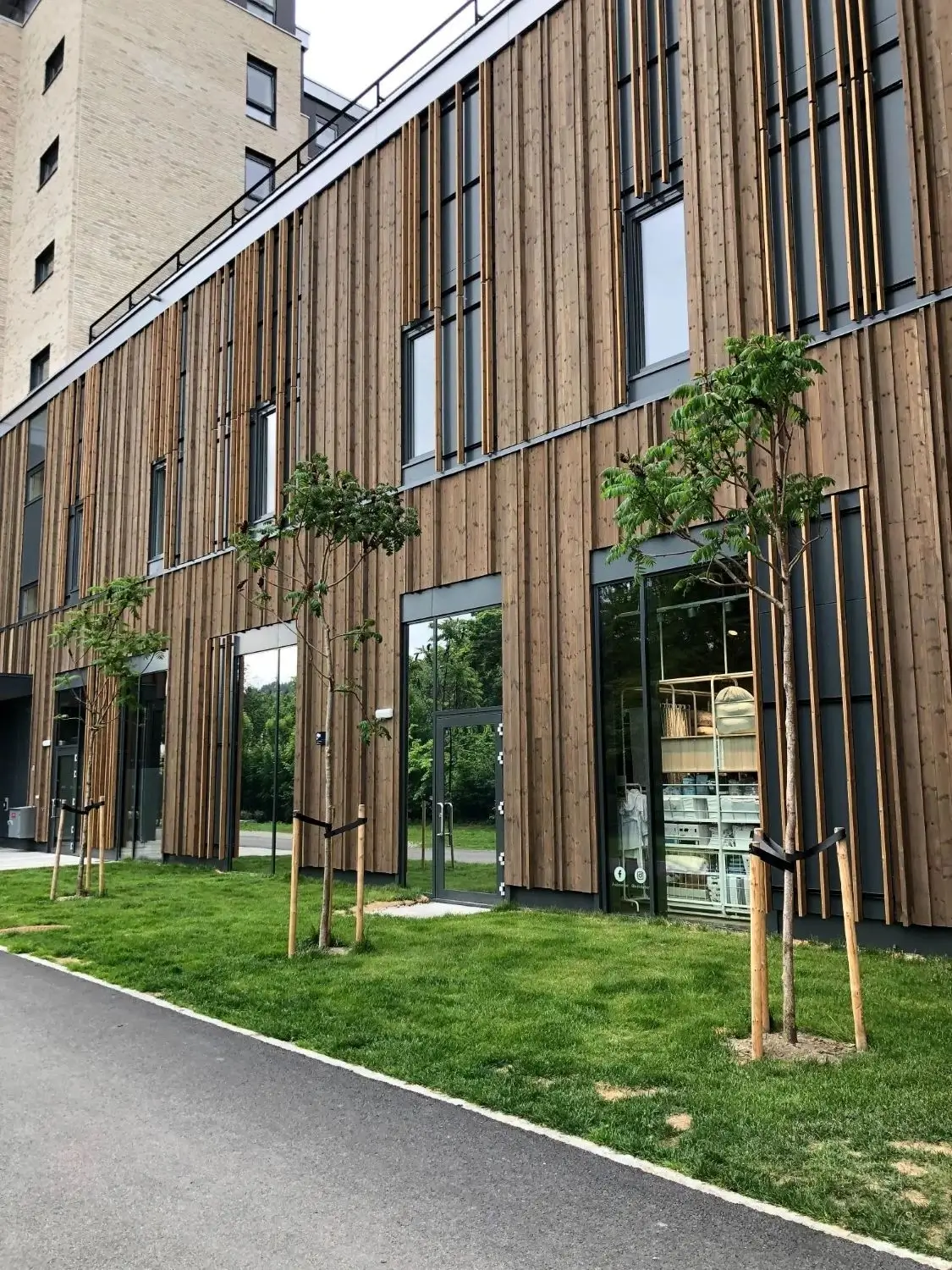 Woodfac Click werd gekozen als geveloplossing, een systeem met duidelijke, scherpe lijnen, snelle installatie, lange levensduur en duurzame en brandbeveiligingsdocumentatie — allemaal noodzakelijke elementen die voldoen aan de eisen van de bouwsector.