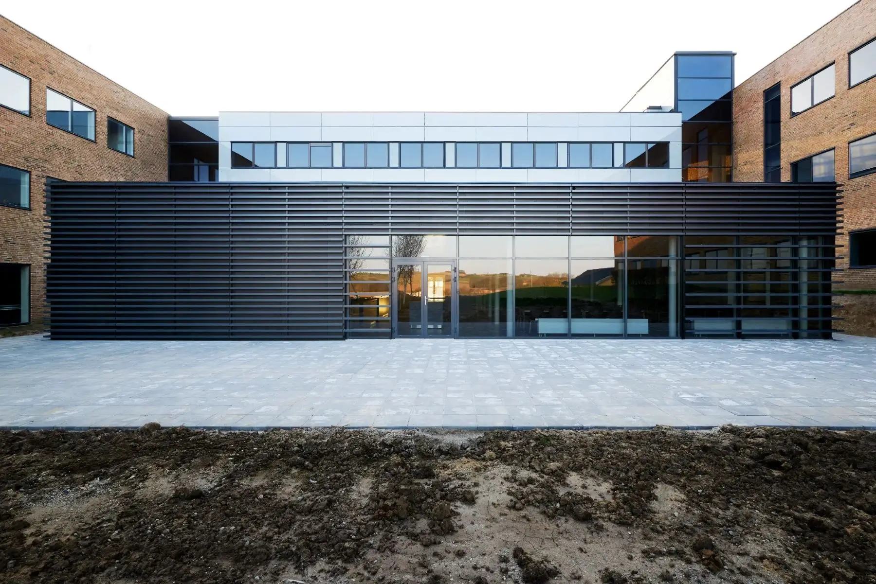 An einem Erweiterungsbau wurde das Napsu-Fassadensystem installiert - ein System, das aus Aluminiumpaneelen besteht, die auf einer Aluminiumstruktur montiert sind.