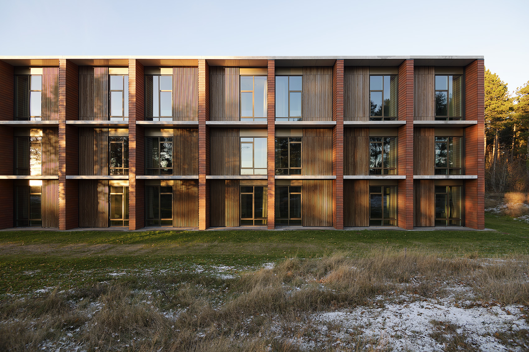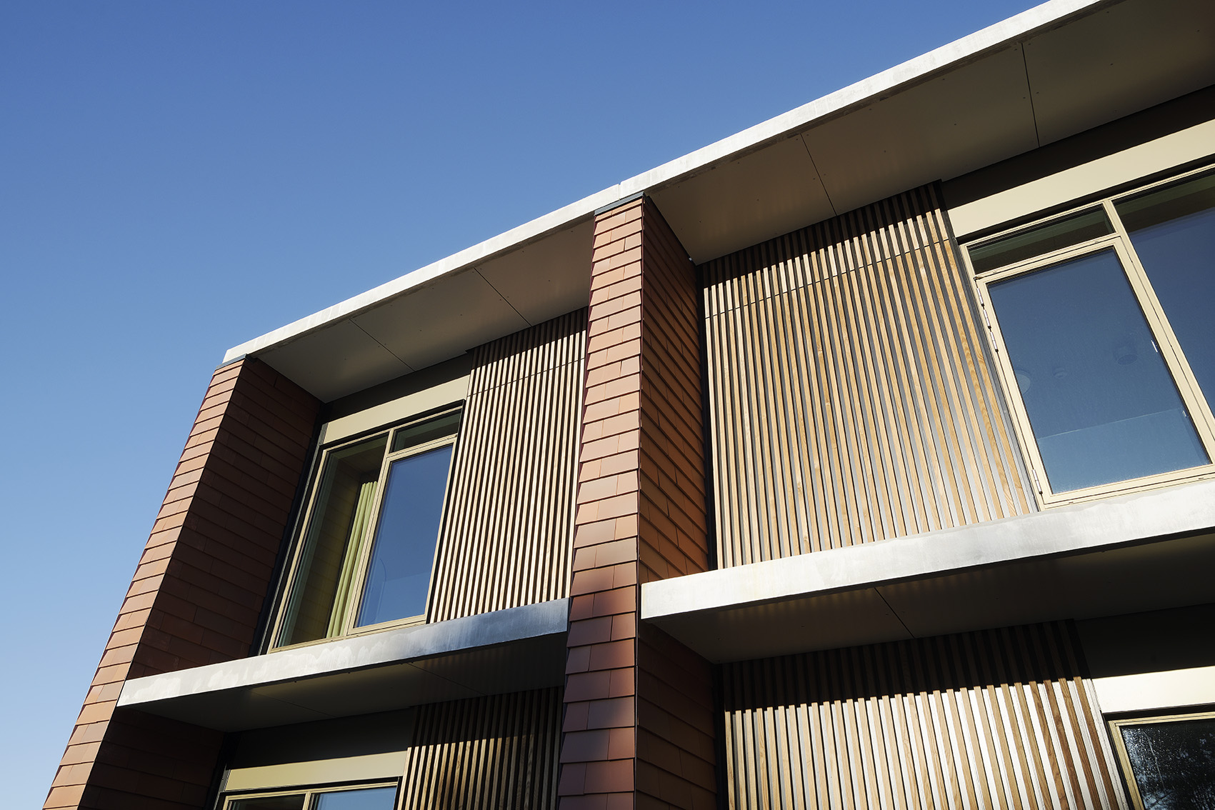 Nordisk Profil hat zu diesem Projekt mit Klimaverkleidungen aus Thermoesche beigetragen und das geschlossene Fassadensystem Woodfac Panel an den Fensterpartien geliefert. Die Lamellen wurden in der Abmessung 34 x 34 mm gefertigt und mit einem Achsabstand von 70 mm montiert. Das Design kann jedoch vollständig an die Wünsche des Projekts angepasst werden – sowohl in Bezug auf die Abstände als auch auf die Längen.